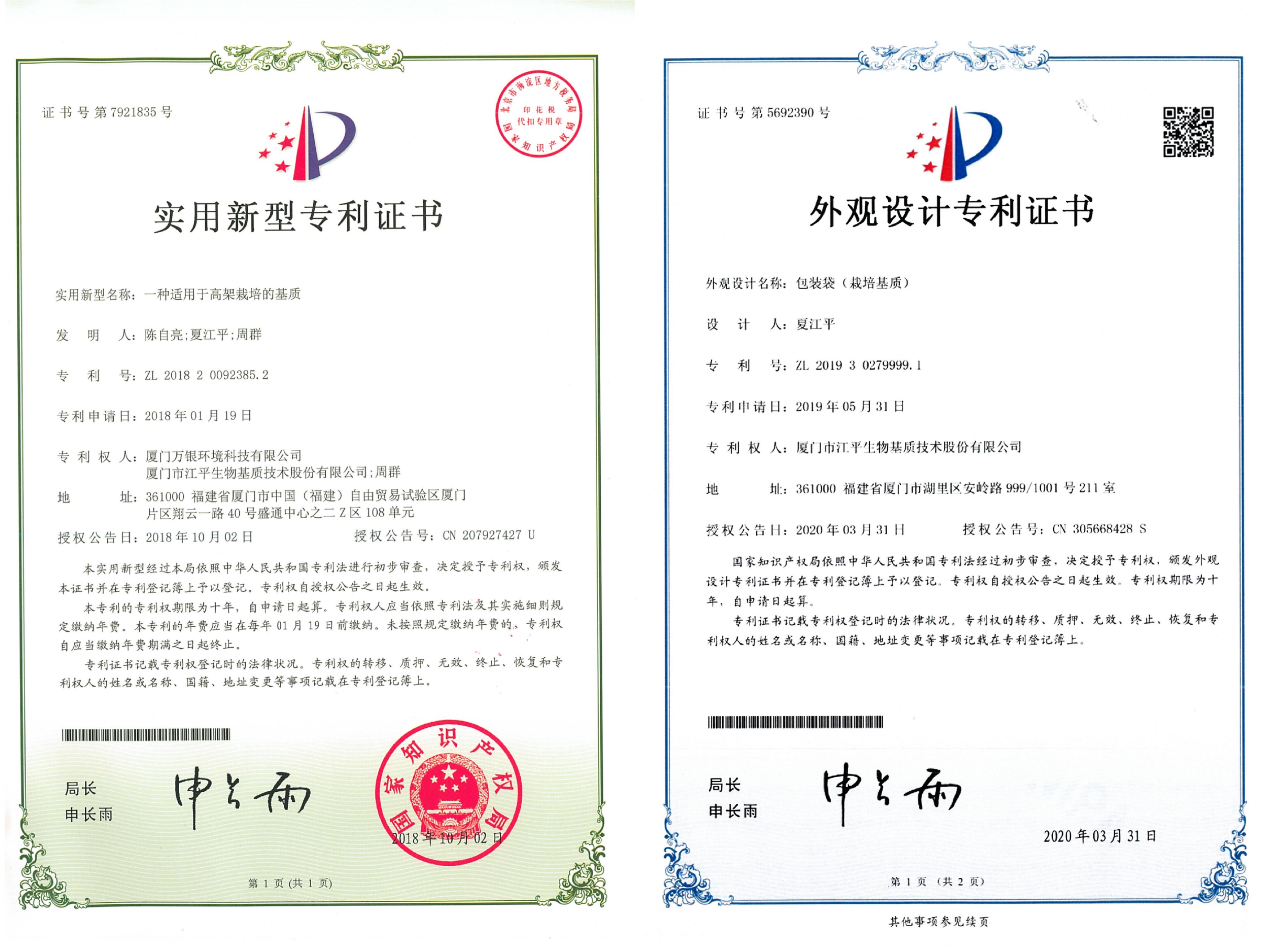 十八年來,江平生物秉承“讓土壤重回活力”的使命,將自主研發和技術創新作為公司發展的重要目標,截止目前已累計獲得32項授權專利,其中發明專利8項,實用新型專利22項,外觀專利2項,另有在審專利9項。針對三角梅,江平生物通過自主研究設計不同的基質配方,篩選適合三角梅盆栽種植和高架栽培的配方基質,最終得到科學的、完整的、標準化的盆栽型和高架型三角梅栽培基質,并獲得“一種適用于高架栽培的基質”、“包裝袋(栽培基質)”等授權專利。